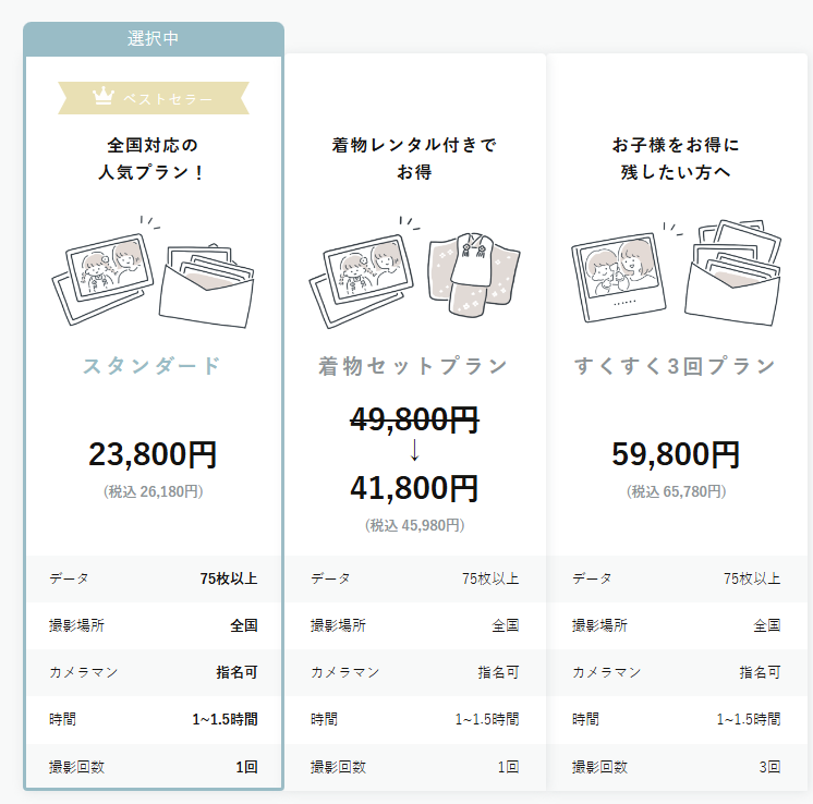 すべて全国対応・カメラマン指名可・撮影データ75枚以上・撮影時間1~1.5時間で、着物セットは衣装レンタル付き、すくすくプランは3回分の成長記録を残せます。