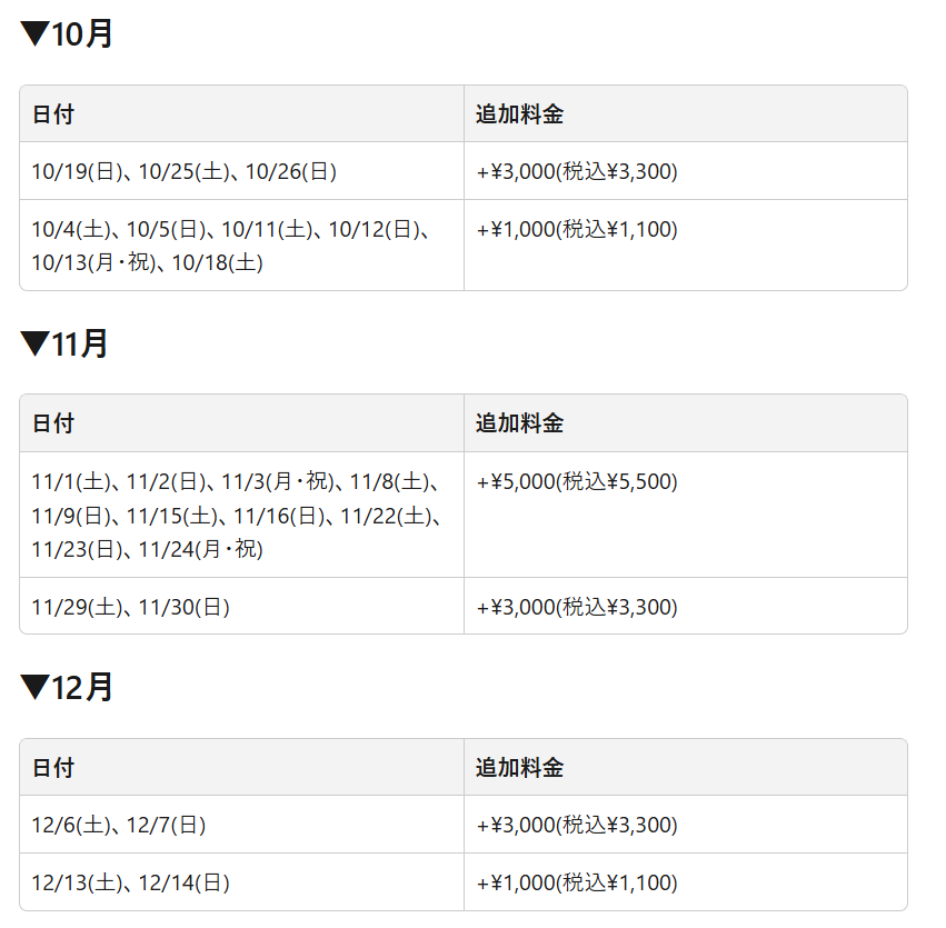 土日は料金変わる?一部日程での追加料金(シーズナル料金)について