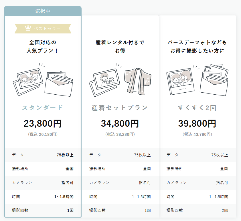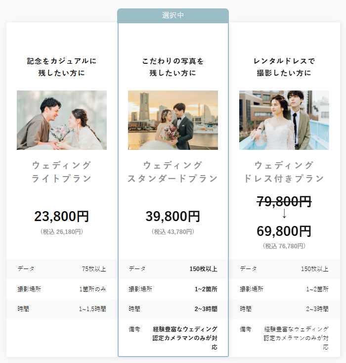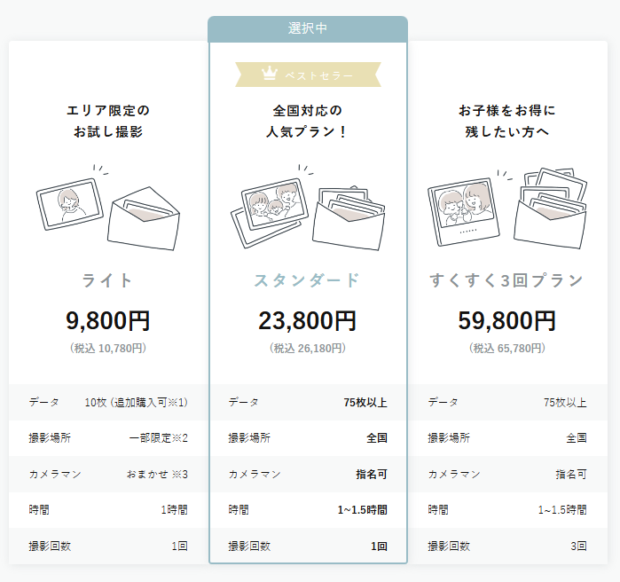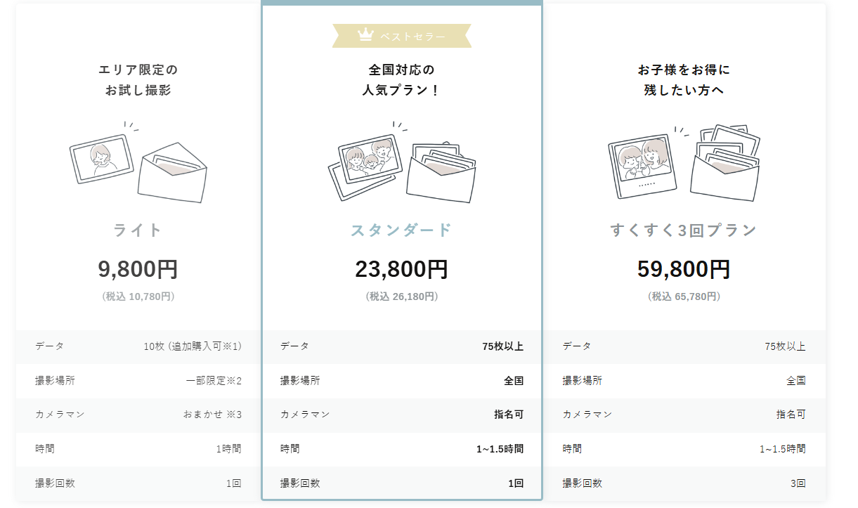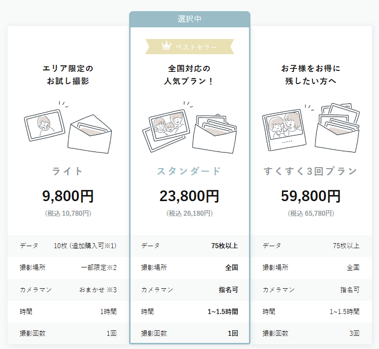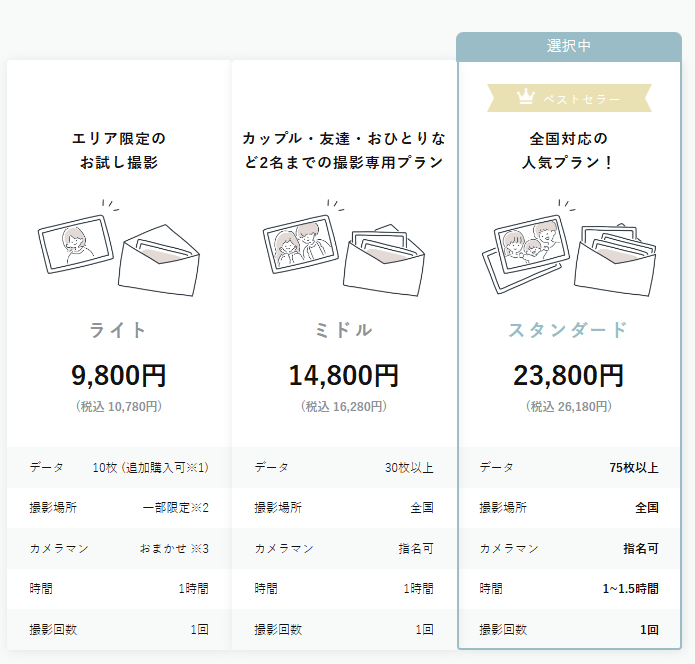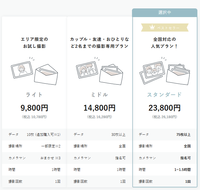 ライト、スタンダード、各撮影シーンによるプランがあり、用途や予算に合わせて選べます。ライトはお試し向けの低価格プランで、一部限定エリア対応。スタンダードは全国対応で、75枚以上の写真データが付く人気プランです。