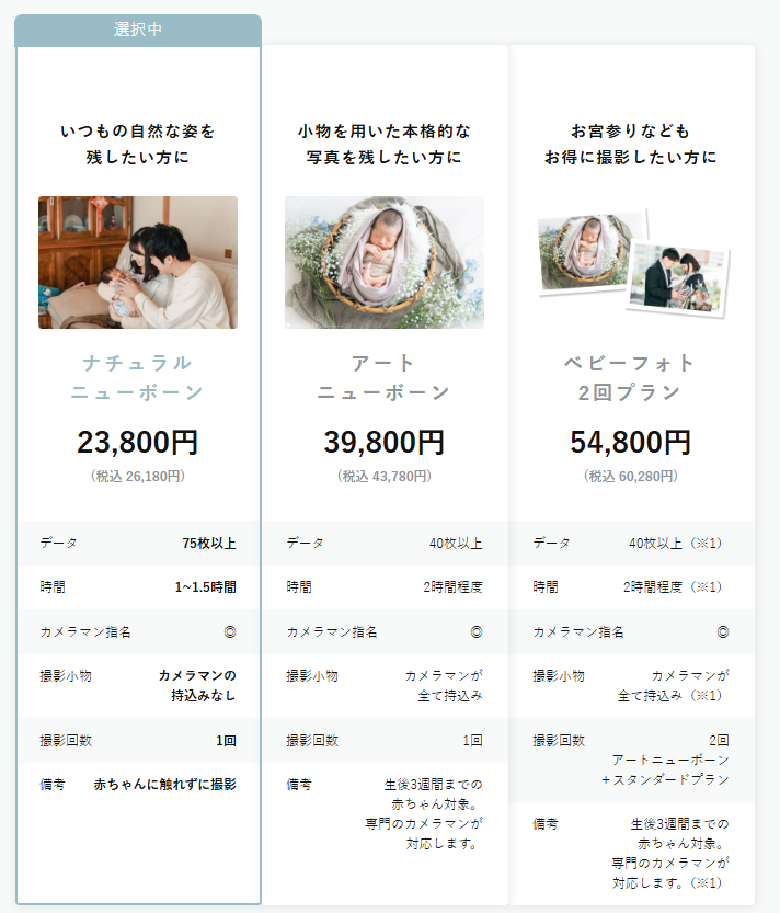 備考 | 赤ちゃんに触れずに撮影 | 生後3週間まで対応、専門カメラマンが訪問 | 生後3週間まで対応、専門カメラマンが訪問 |