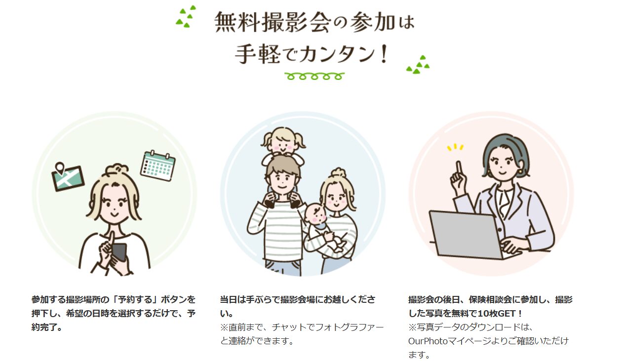ただしデータを受け取るには、撮影会後日に行われる保険相談会に参加する必要があるので注意です。