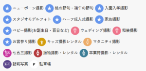 | 撮影メニュー | 七五三、成人式、お宮参り、バースデー、マタニティ、ウェディング、ファミリー撮影など |