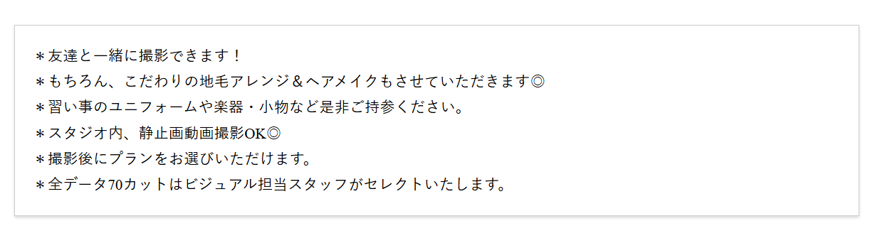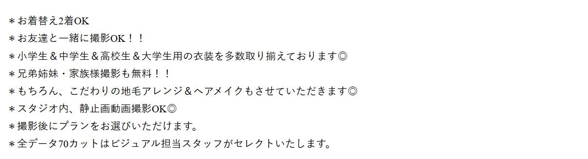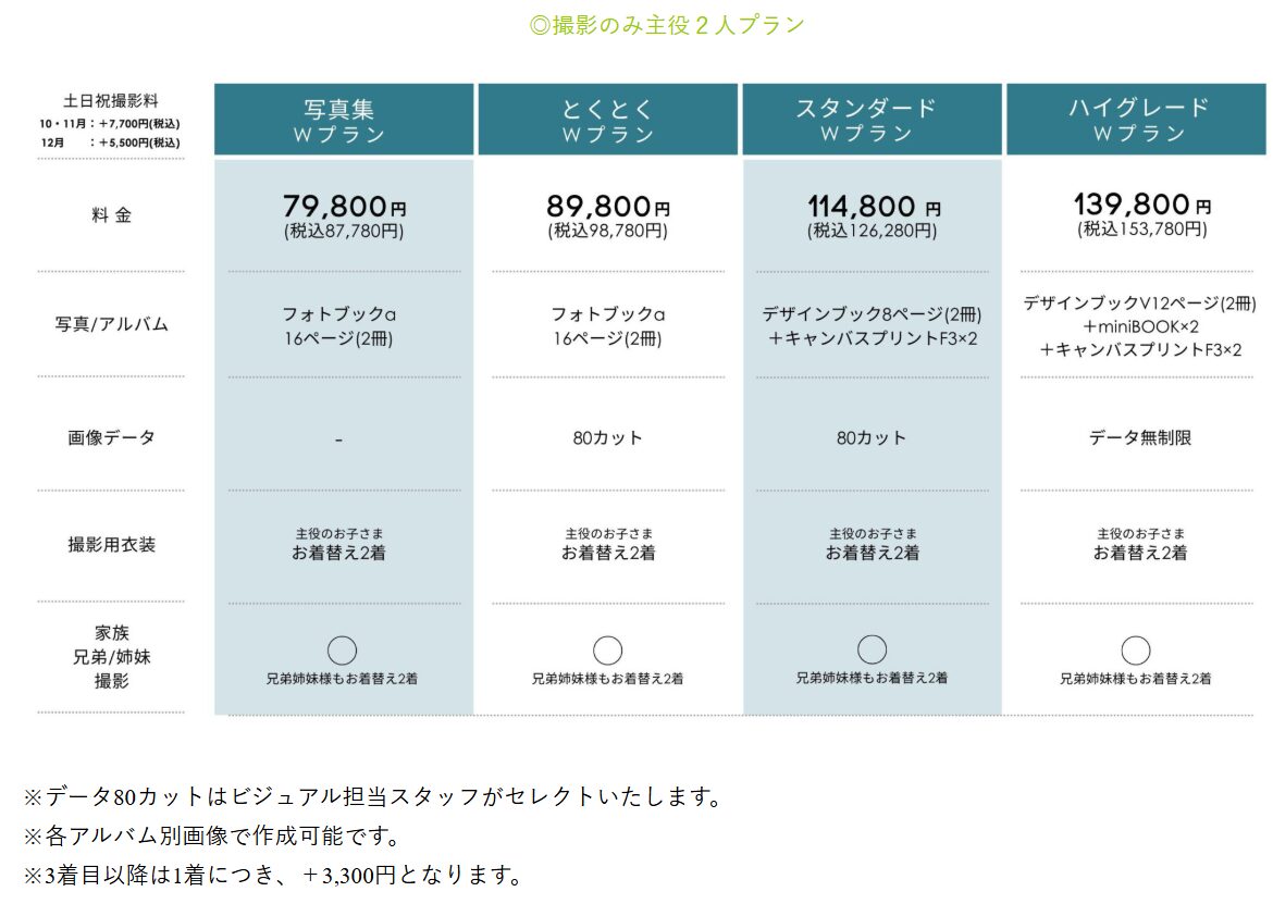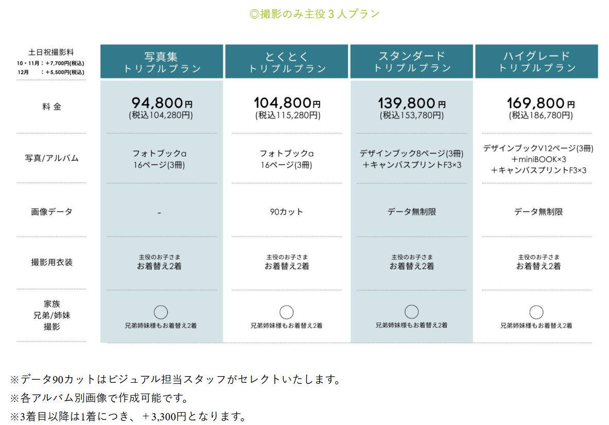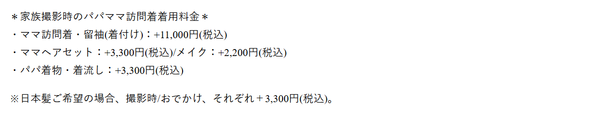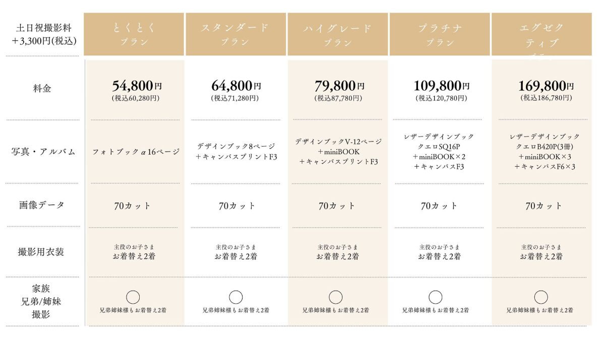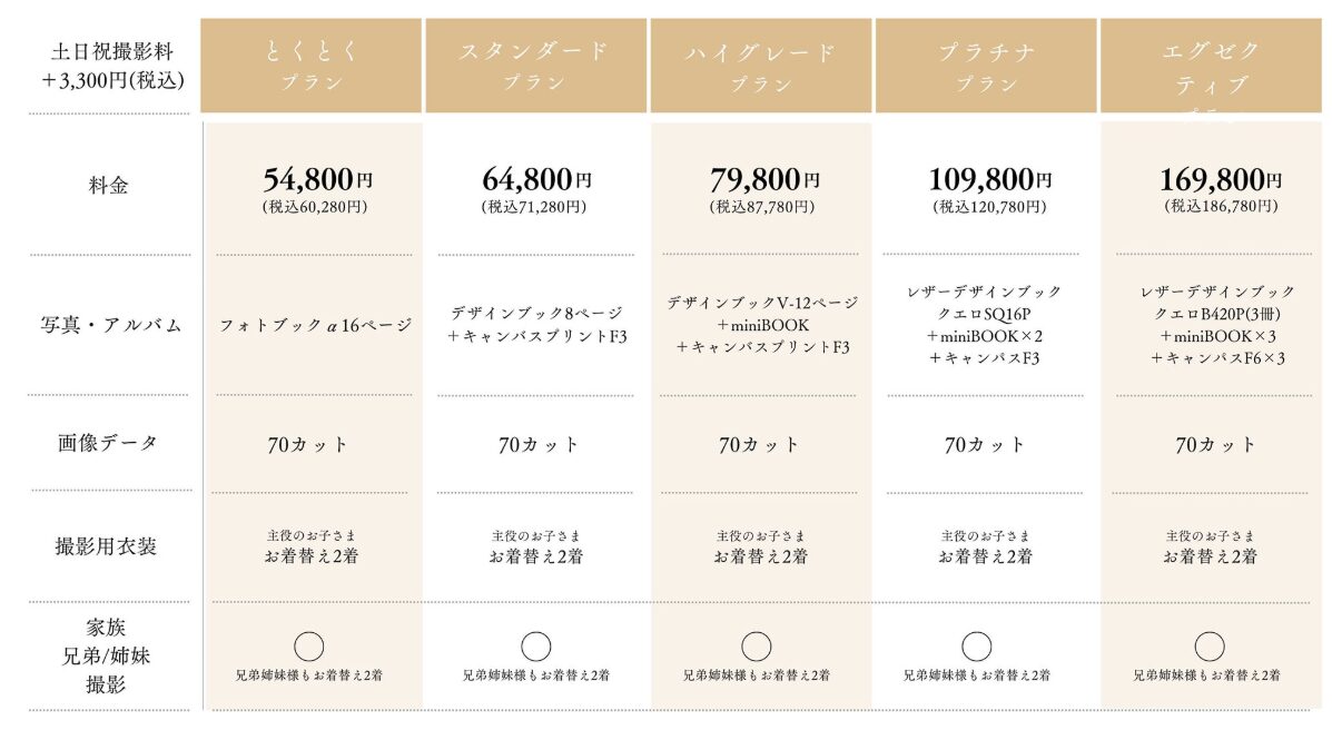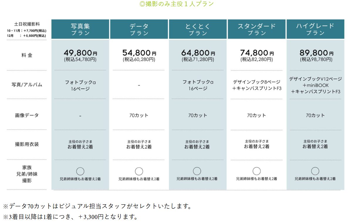 | 料金 | 撮影料、衣装レンタル、ヘアメイクなどのセットプラン、土日祝追加料金など |