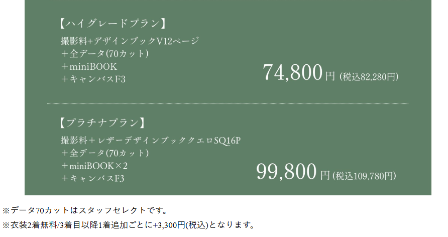 | 写真・アルバム | フォトブック16ページ等~ ※プランによって異なる |