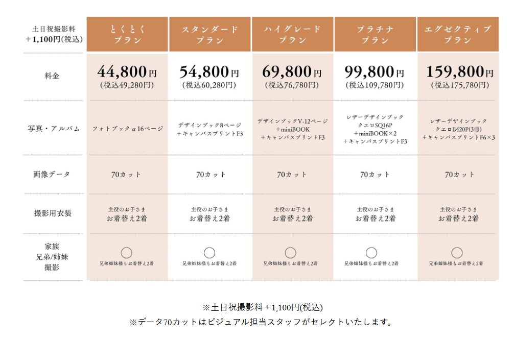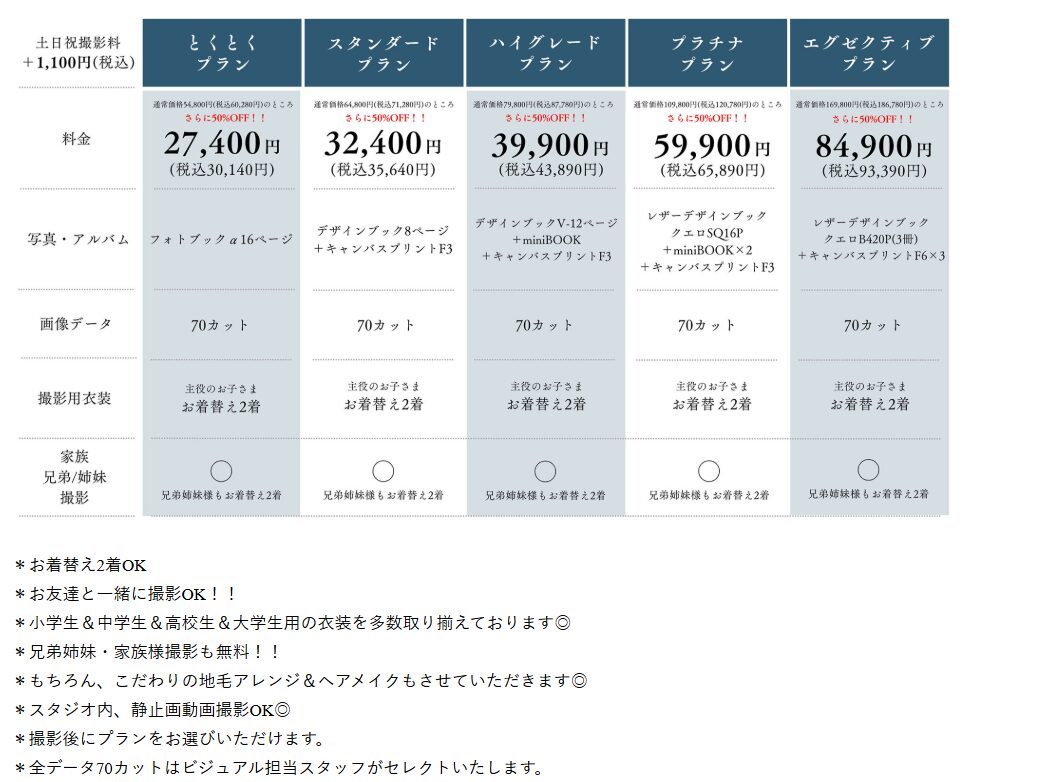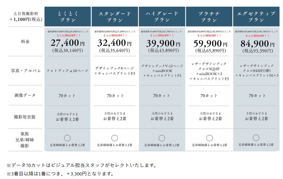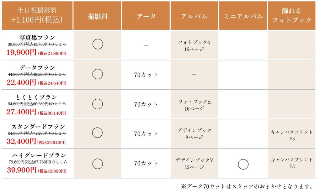 | 七五三撮影オフシーズンプラン | 【 写真集プラン 】 撮影料+衣装2着+フォトブック16ページ → 29,800円(税込32,780円)※土日祝撮影料+1,100円(税込) 【 データプラン 】 ※土日祝撮影料+1,100円(税込) |