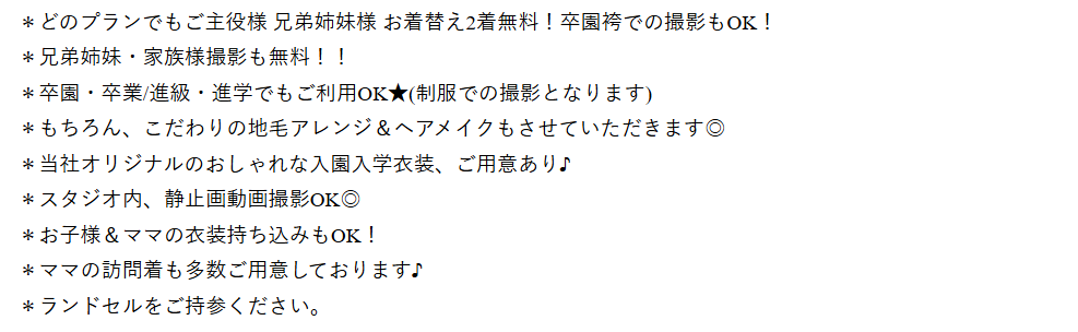 - 兄弟・家族撮影無料、スマホ撮影もOKで自由度の高い撮影環境を提供