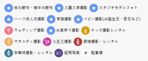 | 撮影メニュー | 七五三、成人式、お宮参り、バースデー、マタニティ、ウェディング、ファミリー撮影など |