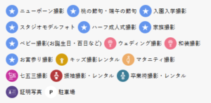 | 撮影メニュー | 七五三、成人式、お宮参り、バースデー、マタニティ、ウェディング、ファミリー撮影など |