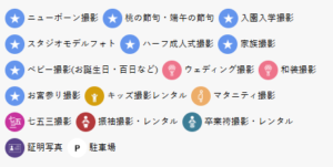 | 撮影メニュー | 七五三、成人式、お宮参り、バースデー、マタニティ、ウェディング、ファミリー撮影など |