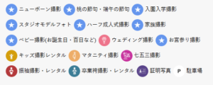 | 撮影メニュー | 七五三、成人式、お宮参り、バースデー、マタニティ、ウェディング、ファミリー撮影など |