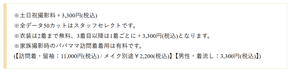 | 料金 | 撮影料、衣装レンタル、ヘアメイクなどのセットプラン、土日祝追加料金など |