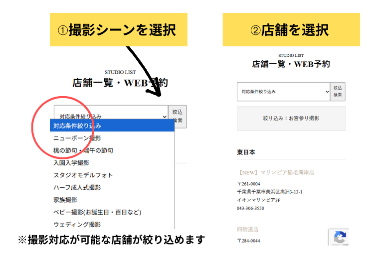 ※最初に「対応条件絞り込み」を行えば、撮影対応が可能な店舗が絞り込めるので、先に絞り込みをすることをおすすめします。