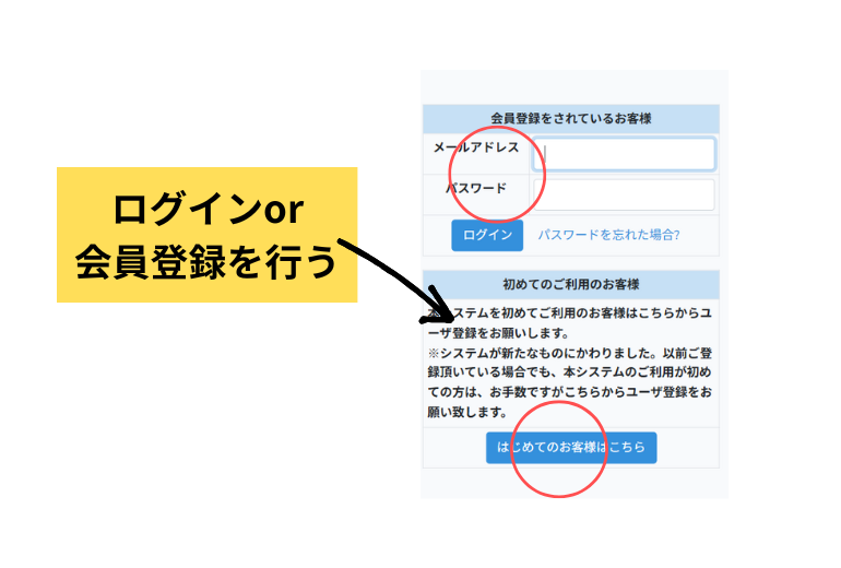 利用したことある方は「ログイン」、初めての方は「会員登録」を行う
